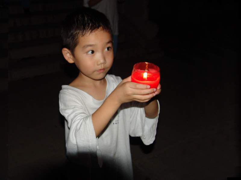其实,每位营员的心中都有一个期待——传灯法会。而这一刻终于在夜幕缓缓降临时到来了。全体僧众及营员齐聚万佛楼,静立黑暗中,等待点燃心灯的那一刻。当明海大和尚点燃第一盏莲灯,其实也点亮了每一位营员的心灯。柔和的灯光足以驱逐千年的黑暗。营员们从师父手中接过一盏盏莲灯,缓步来到万佛楼前广场,在夏夜的微风中注视摇曳的火光,虔诚唱颂观音圣号。圣号声声润法界,莲灯盏盏照心明。营员们手捧莲灯,一步一唱的走向赵州古塔,走在一条通往光明的道路上。巍巍古塔上,莲灯越放越多,光光相映,遍照黑夜,美不胜收。安放完毕莲灯,营员们则把事先写好的发愿文和忏悔文在香炉里烧掉。在忏悔中消除业障,在愿力中得到永生。