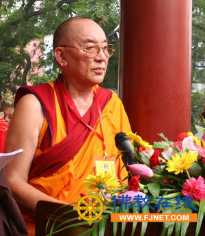 图:中国佛教协会副秘书长那仓·向巴昂翁活佛在法会上宣读和平祈愿文