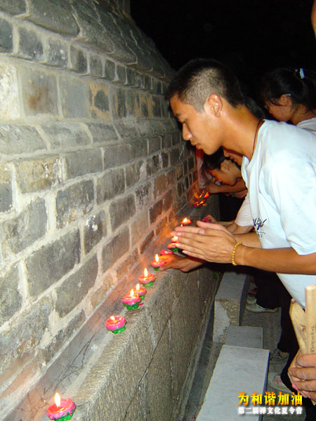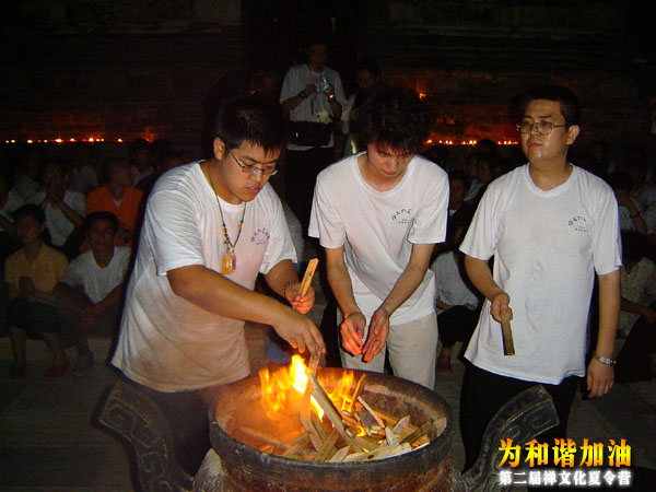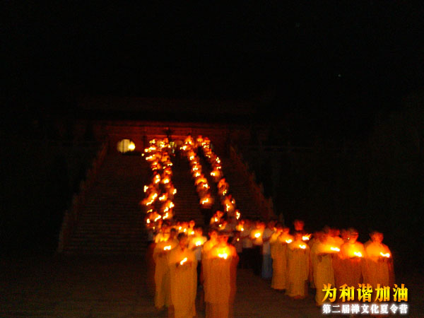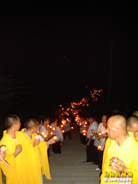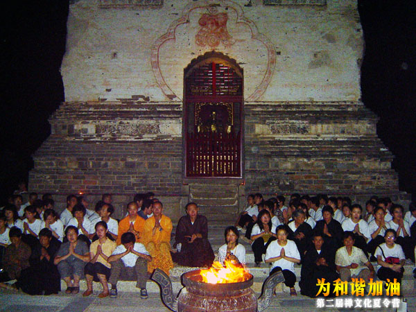 呵护着手中的这盏莲灯,伴着晈洁的月光,营员们齐唱《燃灯之歌》缓步走出山门,拾级登上双峰山千级石阶,走向毗卢塔。点点烛光汇成无尽光明海。山无言,禅无语,只有感恩在心间。营员们庄严的将莲灯供养在毗卢塔前,将发愿卡投入到燃烧的炉火。请四祖作证,愿我们能担当起度众生的神圣使命,承担起国家民族复兴的历史重托。大家静静的坐在毗卢塔下,倾听着那仿佛来自远古风的声音,倾听着来自心灵的声音。男女营员代表共同读诵了《传灯回向文》。(文:小赵州)
