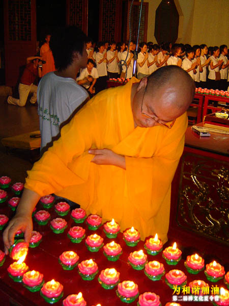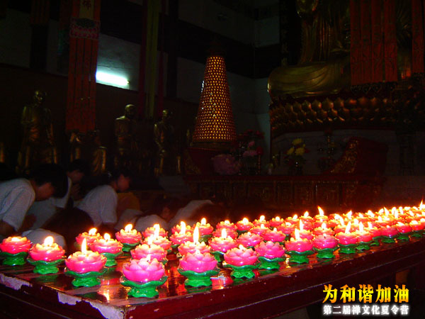 夜色悄悄来临。7:30营员们期待以久的传灯法会在大雄宝殿举行。庄严的梵唱响起,神圣感由然而生。灯象征着佛法的光明与智慧,愿人人都能点亮慈悲喜舍的心灯。营员们从法师手中接过点燃的莲灯,愿此智慧灯能灯灯相续,绵绵不尽。
