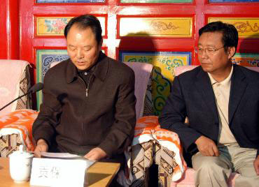 8月10日,甘肃省宗教局局长贡保甲(左)在贡唐仓活佛转世工作指导小组第九次会议上宣布关于认定第六世贡唐仓活佛转世灵童的批复。