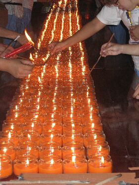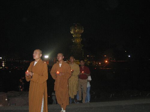 晚上,明奘法师指导部分法师和全体营员一起举行了传灯法会,无锡市一百余位居士随喜参加。传灯象征薪火相传,意义非凡,营员们都格外专心投入。在大家怀着无比崇敬的心情观看了大型动态雕塑“九龙灌浴”后,在悠扬了梵音中,江苏省佛教协会副会长兼秘书长,苏州北塔报恩寺、报国寺方丈弘法大和尚为本届夏令营传灯法会点燃了第一盏心灯,然后,大家手捧莲灯,从“九龙灌浴”前,缓缓将灯供奉到了巍峨的灵山大佛脚下,祈愿在大佛的护佑下,心灯常明,智慧常在。