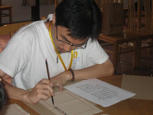 下午,先由江苏省佛教协会副秘书长、省书法家协会会员明远居士给营员讲授书道,然后指导营员亲自实践,临摹普贤普萨十大行愿,进一步明确了夏令营的“行愿”主题。接着,灵山实业公司的总经理吴国平居士和营员们做交流并回答营员们所提出的问题。