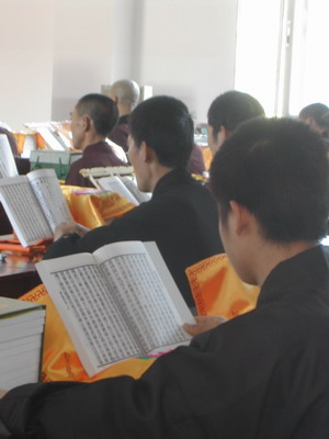 进门后,听到大众在唱诵的声音。心中诧异,因为在半夜,我们都听到了晨钟和朝时课诵,这是上午的时间啊。。。原来是今年结夏安居的华严法会。