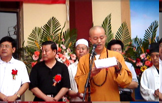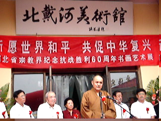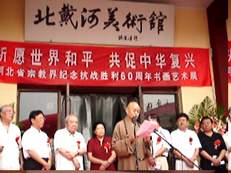 这次艺术展以纪念中国人民抗日战争胜利暨世界反法西斯战争胜利60周年为主旨,由省佛教协会、道教协会、伊斯兰教协会、天主教“两会”、基督教“两会”主办,共有200多幅作品参展。展览将于8月7日结束。省佛教协会会长净慧法师代表河北五大宗教界人士致辞。他祈愿世界和平,永无战争;祈愿国家安定,昌盛繁荣;祈愿我国宗教界在中国共产党的领导下,发扬“爱国爱教”优良传统,推动中华民族伟大复兴。(图片提供;佛教导航)
