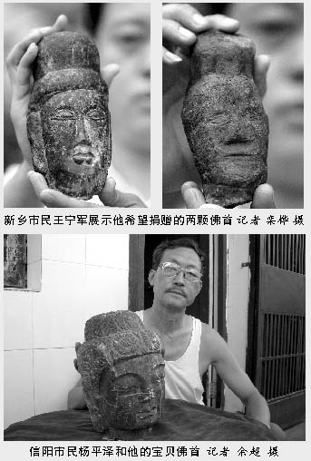 “看了你们报纸7月26日关于龙门佛首回归的报道以后,感觉你们对龙门的问题说得很实在,也觉得很有必要跟你们交流一下,因为我收藏有两个疑为龙门流失的佛首,想通过你们捐献给龙门。”8月1日,新乡市民王宁军打电话跟记者联系,希望记者帮忙联系龙门管理部门捐献他收藏的龙门文物。