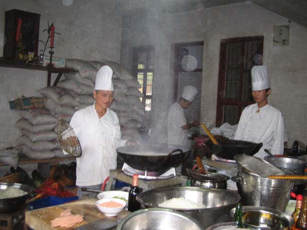 热气腾腾的灵岩山斋堂厨房一景。我们在供斋任务的要求上必需做到:米泔菜叶不弃于地。正在起油锅的正是枣子树的元老厨师长:枣子树淮海店陈德瑜。