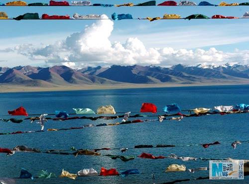 信徒把写有经文的五彩经幡高高挂在湖边的山上