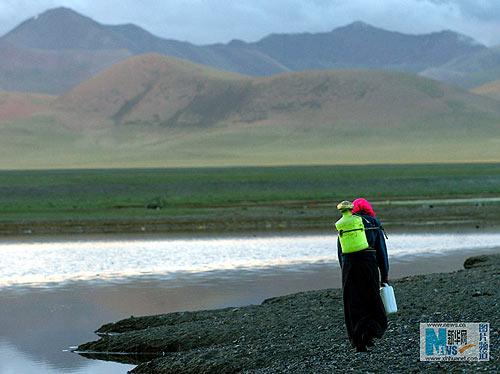 清晨,一名藏族妇女在纳木错湖边背水