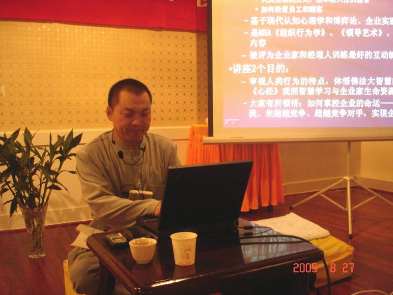 28 日晚,老和尚净慧法师专程从外地赶来参加了闭营式,并为大家作了开示。首先他肯定了这次活动的意义,其次他希望各位企业家能够将这两天来在柏林禅寺里体会到的禅的精神带到生活和工作中去,并回答了营员的提问。