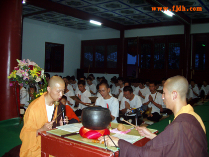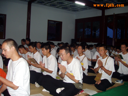 8时,营员们开始了每日例行的坐禅。明基法师作了简短的指导后,营员们打坐10分钟。随后几位营员与大家分享了打坐的体会。明基法师在总结时说,坐禅是了解自己生命现象的的方法,要坚持,每一次打坐都是在重新认识自己,提高自己。初学打坐的人要鼓励自己,相信水滴石穿,一定会受用无穷。