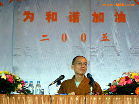 下午西园寺宗舜法师为大家作了题为《佛教的和谐观》的讲演。宗舜法师结合此次夏令营“为和谐加油”的主题采撷佛法大海中的一滴甘露,给大家讲解了和谐一词对佛教修学的重要意义。宗舜法师从“不二法门”入手,从古籍经典中探寻和谐的本源。并将“和”“谐”二字拆分开来指出佛教中“和”是对生命和自然的尊重。“谐”体现在中道正观,在认识论方面要获得正见,在方法论层次要付诸实践,要以般若智慧作指导,落实到八正道,落实在实践中。法师对佛教和谐观对构建和谐社会的积极意义和价值表现有三,即用佛法六和敬推动社会和谐,用佛教的慈悲心推动人格的和谐,以佛教报恩的心推动道德的和谐。宗舜法师以渊博的学识,敏锐的机锋和无碍的辩才赢得了大家的热烈掌声。讲演结束后法师解答了营员的提问。