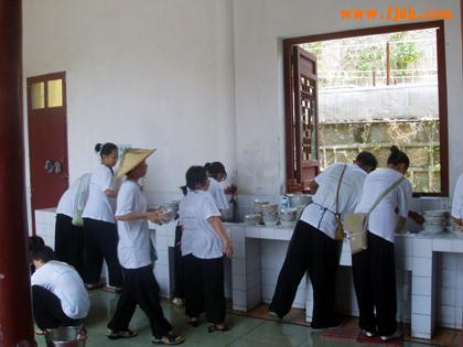 当夜幕还没有从双峰山退去,营员们已经列队集合在藏经楼前,开始了一天的活动。营员们每日的依据《生活禅日课》,进行早课。