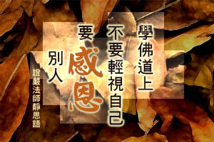 证严:我想人最重要的就是守本分,自己规规矩矩做自己,做我自己,尽本份站在自己的岗位上就可以了。当然,要先自爱才能去爱人,不自爱,嚼槟榔明明知道它对身体有伤害,喝酒、抽烟,对身体都是有害无利的,所以要他们先自爱,做个很清清楚楚的人,明白自己人生的方向,他就不会很容易,心情容易被激动,像喝酒一样,抽烟也一样,吃槟榔也一样,所以这对个别人没有什么关系,但是对自己有很大的关系,所以要先对自己要先疼惜,要先爱(自己)。