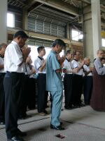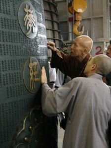 8月23日上午,圣严法师及法鼓山僧俗四众一行三十六人赴日本本州高冈市,参加了巨型梵钟“法华钟”的第一次撞钟测试。上午10时,圣严法师主持了虔敬的绕钟祈福仪式。仪式上,大众随圣严法师持诵“南无妙法莲华经,南无法华会上佛菩萨”等句偈,环法华钟右匝绕行半小时,祈愿法华钟制作顺利圆满。