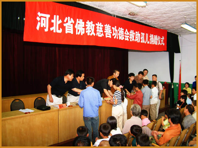 2005年8月21日河北佛教慈善功德会常辉法师一行赴秦皇岛青龙县资助孤儿。青龙县副县长张文成、青龙县妇联主任孙丽君、青龙县民政局长田秀林参加了资助大会。青龙县民宗局黄文超局长主持了大会.现场将资助款发到孤儿手中。