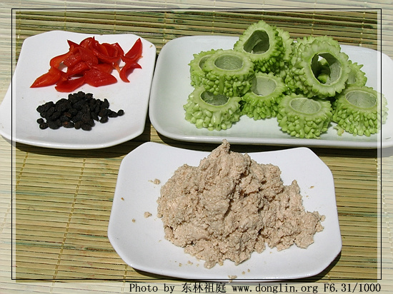 主料:苦瓜250克,豆腐100克,干素肉丝50克