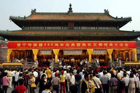 据承德日报报道:8月28日,秋高气爽,硕果飘香。河北承德普宁寺一派节日气氛,门前各色彩条飘飘、“哈达门”上“普宁寺250周年,躬迎天下宾朋”的字幅格外醒目,被帷幔、唐卡、楹联、横幅装饰一新的普宁寺迎来了250周年华诞。上午8时,普宁寺肇建250周年暨胜乐王佛传承大法会庆典活动开幕式在大雄宝殿前隆重举行。