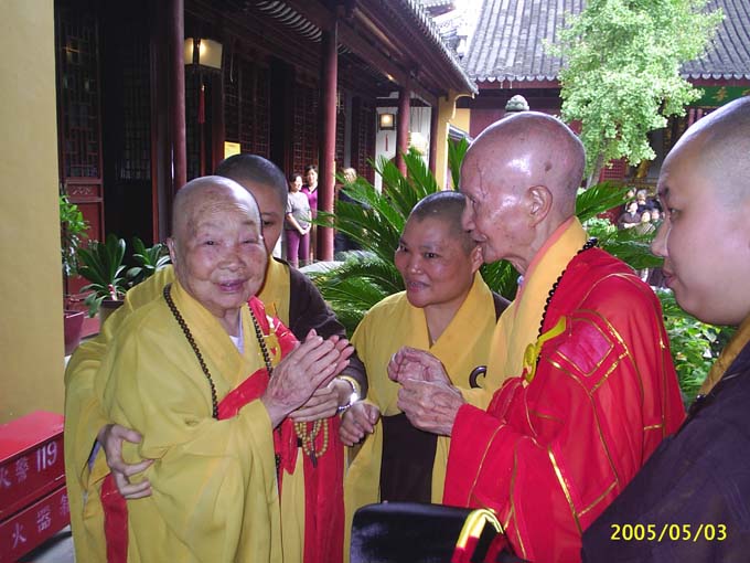 上海沉香阁方丈94岁高龄的上观下性大和尚和长老亲切交谈。