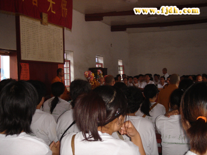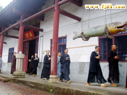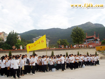 早斋后营员们在大雄宝殿前集合,准备到云居山行脚。四祖寺常住法师、营员、义工们分乘8辆大巴,经黄梅过长江,前往五宗道场云居山真如寺。