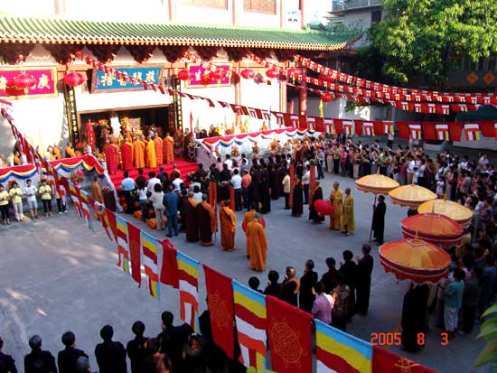八月三日上午七时,广东佛山市仁寿寺隆重举行送子观音圣像开光庆典,寺内彩旗飘扬,幡绦醒目,烛明云袅,近万名僧俗信众济济一堂。仁寿寺住持明生法师,恭请光孝寺方丈新成大和尚等五位大德长老一起主持开光仪,前来赴会的有国家宗教事务处杨同祥、广东省民宗委符永培副处长以及佛山市民宗局局长等领导。
