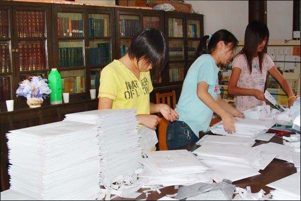 弘法部图书馆,前来帮忙包装、邮寄杂志的学生义工