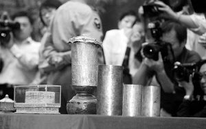 “从盛放舍利的三层容器上看出,此舍利曾经被帝王供养过。”据辽宁省博物馆佛教专家张力介绍,盛放舍利的容器一共三层。最里层是玛瑙舍利罐,舍利就放在这里;二层为金棺;最外层为银棺。因出土时银棺上刻有皇帝、皇后供养佛舍利的景象,因此推测出此舍利可能曾被帝王供养过。交接国宝