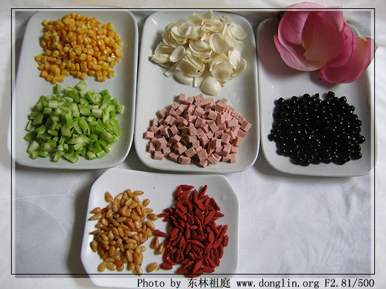 【副料】松仁30克;枸杞子30克;香油(麻油)少许,荷花瓣少许