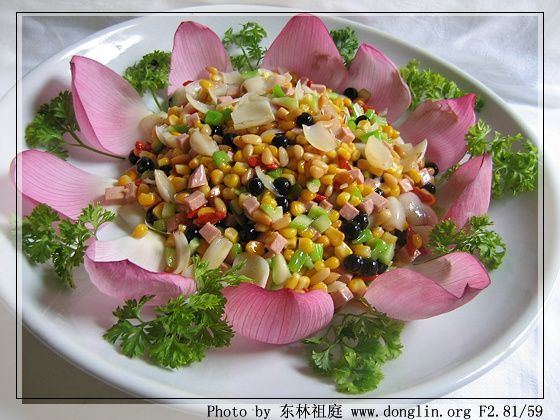 7、另起锅,锅中加入少许水,分别将粟米粒、黑珍珠粒、百合、速火腿粒、西兰花茎粒,一同倒入调味打芡,再将枸杞子、松仁放入,翻炒一下,最后淋上香油出锅,将先准备好的,用荷花瓣围边好圆盘,将菜慢慢的放在花瓣中间即成。