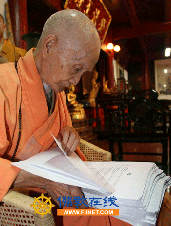 惟贤老和尚认真翻阅即将出版的《七塔寺人物志》
