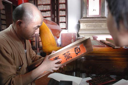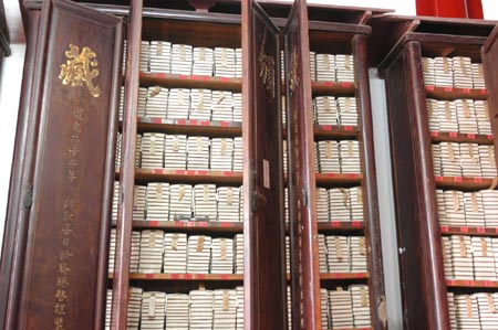 昨日,记者走进平时门户森严的藏经阁,见到清代康熙及乾隆分别于1715、1742年赐予涌泉寺的12个巨大的御书橱,以及置于其上的数量众多的佛教经卷。但藏经阁内确实比较潮湿,印空法师告诉记者,为了避免经书受潮,寺里每年都要晒经,一般选择在气候干燥的秋季,僧众及信徒约60余人,从殿内鱼贯排成一队,接力将经书从书橱上取下,放在特别制作的晒经架上晾晒,早上搬出去,下午3~4点搬回。