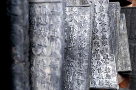 藏经阁边上小房间木架上,堆满石片一样的物体,上刻大量文字,涌泉寺僧人说,这是清《华严经疏论纂要》孤本雕版,共2425块。