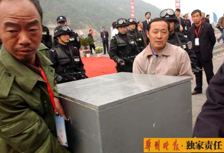 工作人员在防暴警察的护送下,小心的转移装着佛首的木箱。郑州晚报记者廖谦/图