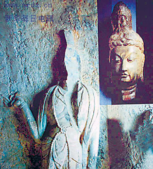 ▲流失海外的洛阳龙门石窟火顶洞左胁侍观音菩萨头像(图右上)和残留的菩萨身不久就能实现身首合璧(10月14日摄)新华社记者 顾立林 摄