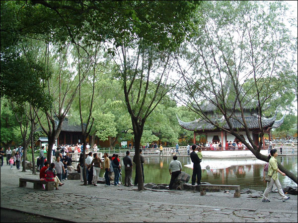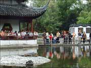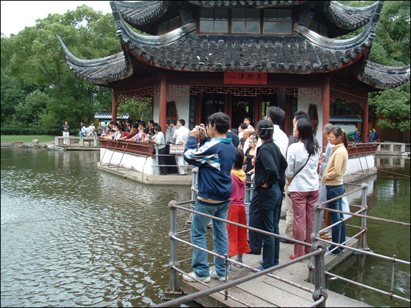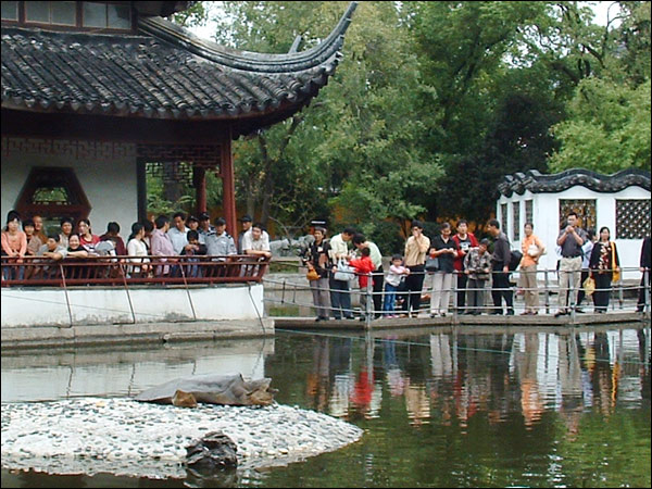 放生池边争相观看的香客游人