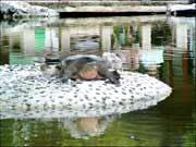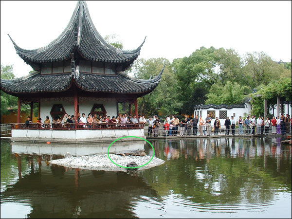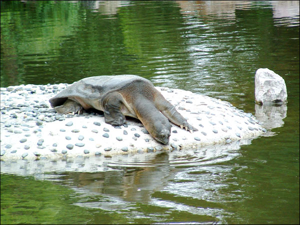 斑鼋喜登岸承沐阳光,为改善二位元老及放生池内数百小龟的居住环境,同时避免游客惊扰,西园寺特别在池西建一登陆小岛。自初秋建成以来,每天都聚集着数十只小龟,嬉戏玩耍,沐浴日光。斑鼋亦常于周围逡巡视察,若隐若现。