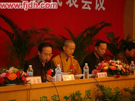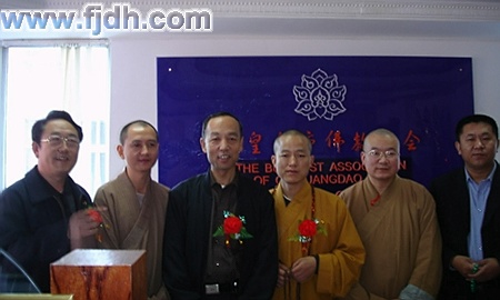 左起:市民宗局李印林局长、副会长果恒法师、省民宗厅朱燕增处长、省佛教协会副会长明海大和尚、会长存海法师、省佛教协会肖占军秘书长