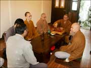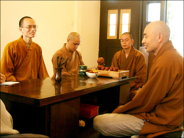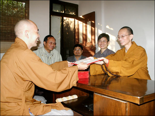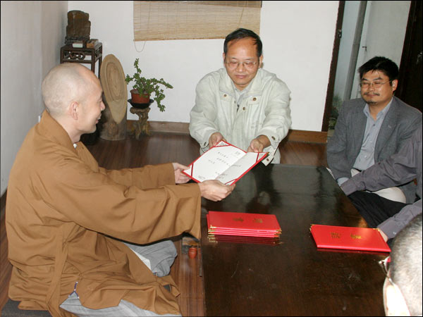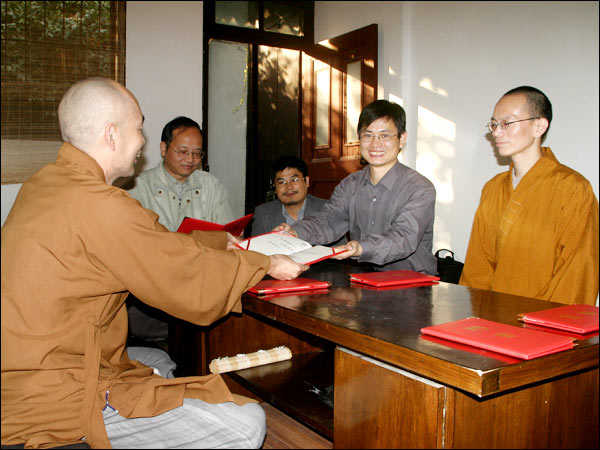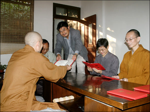 十月八日下午,济群法师代表戒幢佛学研究所向几位法师和长期护持研究所发展的居士学者颁发了研究员聘书。分别是:戒幢佛学研究所研究部主任宗舜法师;英国伦敦大学博士真净法师;闽南佛学院讲师、诗僧戒贤法师;中国社科院博士纪华传居士;南京大学博士、扬州大学佛学研究所所长李尚全居士;上海复习旦大学博士聂士全居士。