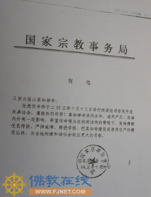 10月13日,享有佛教界“模范丛林”之称的江西永修县云居山真如禅寺隆重举行了纯闻法师升座法会。继前任方丈中国佛教协会会长一诚长老之后,纯闻法师正式继任云居山真如禅寺方丈。国家宗教局、中国佛教协会、美国万佛城等团体和个人发来贺电,中央统战部、国家宗教事务局、省市有关领导,中国佛学院、庐山东林寺派员,海内外诸山长老、护法居士等万余人参加了升座法会。