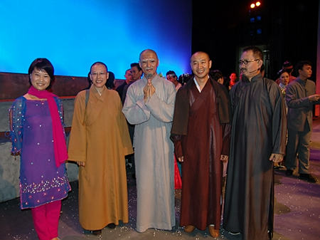 右起:丰子恺扮演者尤俊林、明奘法师、弘一大师扮演者杨伟汉、传闻法师