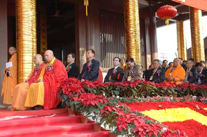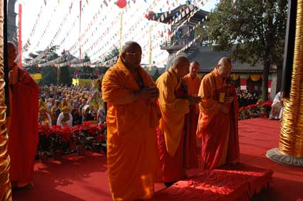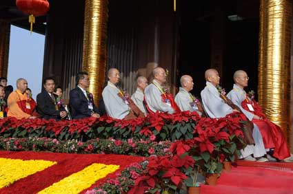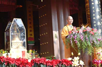 尊敬的 长老、各位大德、 各位贵宾、各位护法居士: 今天,我们欢聚在陕西扶风法门寺隆重举行佛指舍利赴韩国供奉启请大法会,实在是千载一时,因缘殊胜,众生欢喜。在这喜庆吉祥的庄严时刻,我谨代表中国佛教协会,向专程前来迎请佛指舍利的韩国佛教宗团协议会各位高僧大德以及全团所有的成员表示诚挚的欢迎和良好的祝愿! 中韩两国是山水相连的友好邻邦,两国人民之间的传统友谊历史悠久,两国佛教更是法乳一脉,法缘深厚,友好交流源远流长,史不绝书。不久前,韩国佛教宗团协议会,真诚提出迎请佛指舍利赴韩国供奉瞻礼,得到了中国佛教协会的同意,经过中韩两国佛教界及法门寺全体僧俗弟子的共同努力,各项筹备工作已经圆满完成。佛指舍利将于 现在,我介绍一下参加这次佛指舍利赴韩供奉并在主席台上就座的中国护送团、韩国迎请团的主要成员和有关方面的领导。 在这吉祥喜庆的庄严时刻,我宣布:法门寺佛指舍利赴韩供奉启请法会现在开始: 1、首先,请中国佛教协会副会长、护送团团长圣辉长老讲话。 2、请韩国佛教宗团协议会迎请团团长慧聪长老讲话。 3、请中国佛教协会会长一诚长老,中国佛教协会副会长、护送团团长圣辉长老,中国佛教协会副会长、护送团副团长祜巴龙庄长老就位主法。 唱念内容: (1)、香赞(戒定真香) (2)、南无本师释迦牟尼佛(三称) (3)、心经(一遍) (4)、摩诃般若波罗蜜多(三称) (5)、南无大乘常住三宝(三称) 4、请中国佛教协会副会长、护送团副团长明生法师宣读【法门寺佛指舍利赴韩供奉护送文疏】。 回 向: 愿消三障诸烦恼 愿得智慧真明了 普愿罪障悉消除 世世常行菩萨道 5、请韩国佛教迎请团诵经,并宣读【法门寺佛指舍利赴韩供奉迎请文疏】。 6、请在主席台上就座的各位领导以及中国佛教护送团和韩国佛教迎请团的各位高僧大德向佛指舍利敬献香花。之后,分别从大殿外东西走廊离开会场,在工作人员的引导下,前往法门寺博物馆参观。 现在,我宣布法门寺佛指舍利赴韩供奉启请法会功德圆满。 祝愿各位身体健康,吉祥如意。