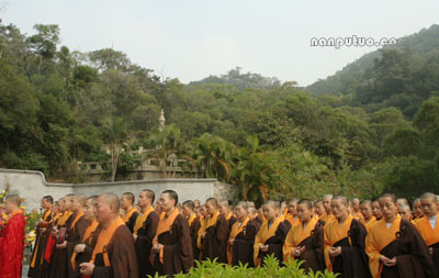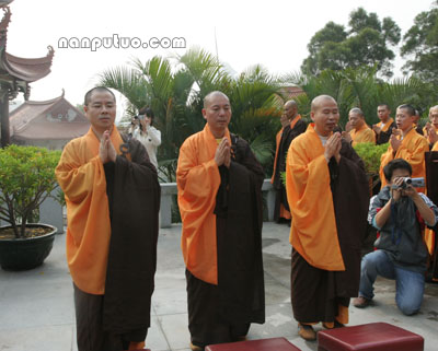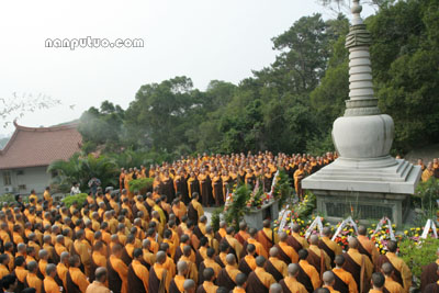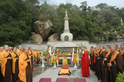 今天上午8时40分,南普陀寺、闽南佛学院、虎溪岩寺和南普陀实业社的僧俗四众排着整齐的队伍在妙湛老和尚舍利塔处,为老和尚祭辰10周年举行佛教祭奠仪式。则悟大和尚与了法法师、界象法师、传明法师等与大家共同礼拜灵塔,诵念佛经。 下午16时,则悟大和尚领众在大雄宝殿为妙湛老和尚举行往生普佛法事。 妙湛老和尚,出生于1910年11月,辽宁丹东人。1939年出家,1957年入住南普陀寺。生前曾任南普陀寺方丈、闽南佛学院院长、南普陀慈善会会长、厦门佛教协会会长。老和尚一生爱国爱教,为佛教教育和社会公益事业孜孜不倦,尤其对闽院的复办作出卓越贡献。慈悲济世精神于海内外享有盛誉。1995年于南普陀寺安祥示寂,时年86岁,戒腊56岁。临终留书“勿忘世上苦人多”的遗训为后人广为传颂。 饮水思源、知恩报恩是南普陀与闽院的优良传统,悼念先贤是此精神在实践中的发扬,更能加强僧人学修并重意识。