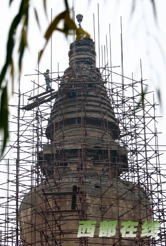 10月31日,工人正在搭建脚手架。作为全国重点文物保护单位的山西代县阿育王塔维修工程日前开工。由于阿育王塔年久失修,毁损严重,国家将投资330多万元对阿育王塔进行修复,预计工程在3年内完成。阿育王塔座落在山西代县城内,始建于隋仁寿元年(公元601年)。塔为圆锥体、佛教藏式造型,塔身上雕刻着各种花饰、荷瓣和印度的“陀罗尼经”。