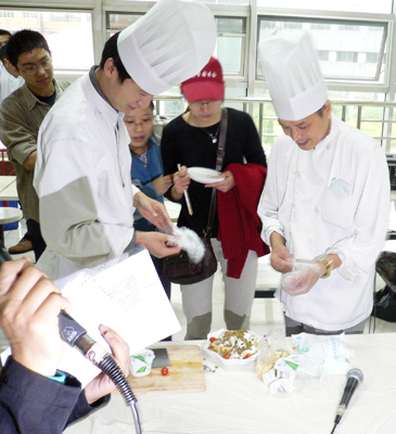 枣子树年轻厨师贾祥国在厨师长陈德瑜师傅的协助下,现场指导同学如何制作美味美观的无蛋色拉。