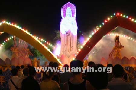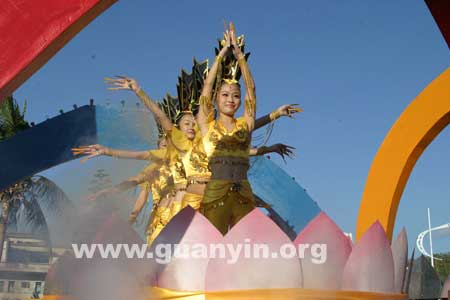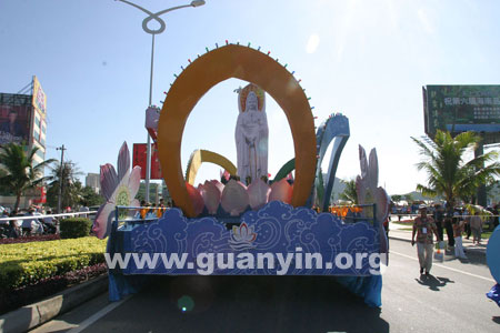 这是由南山海上观音制作的巡游彩车,首次采用了声、光、电、舞结合效果。南山海上观音原身像,庄严慈悲,如法如仪,体现浓郁的观音文化;千手观音随着《观音颂》在莲花宝座上起舞,腾云驾雾,犹如观音现身人间,闻声救苦,普渡众生。