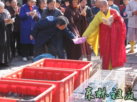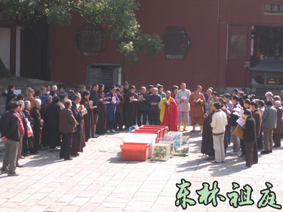 东林寺网站报道:11月29日中午12:30,东林寺护生会在大殿前的广场举行了放生活动,放生功德回向江西地震中的灾民。这次放生主要是鸟和鱼。