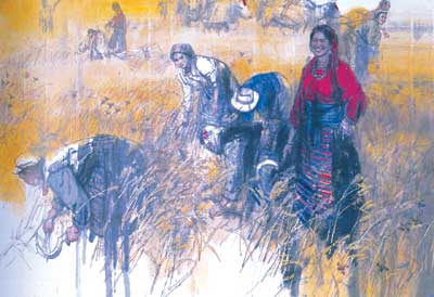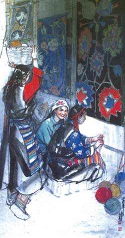 史国良说,他从1979年首次去西藏后,就喜欢上了那个地方,喜欢那里的少数民族风情,喜欢那里的佛教文化,喜欢藏族同胞。从1979年入藏写生至今,史国良以西藏文化为主题进行了大量的人物画创作。他数十次赴藏采风,几乎跑遍了藏区各地,他曾目睹藏族的信徒们从四川阿坝徒步叩拜去拉萨朝圣的壮观场面,曾钻进藏民油渍黑亮的帐篷里与他们同吃同住,曾与牧民策马扬鞭在草原上奔驰。