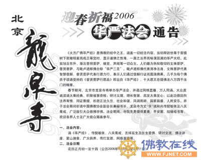 春节期间,北京市龙泉寺将举办华严法会。法会将通过网络直播,举行“万人同诵”活动。届时,与会大众将虔诚读诵大乘经典、研讨佛法义理,以此积聚福慧资粮,增长智慧,启发大乘发心,并回向法界有情,同证菩提,祈愿正法久住,社会和谐,风调雨顺,国家昌盛,人民安乐。法会将礼请中国佛教协会副会长兼秘书长、龙泉寺方丈学诚法师为大众传授皈依及八关斋戒,广泛接引大众信佛学佛。法会期间,寺院免费提供素斋、平安面、结缘经书,欢迎各界人士及广大信众随喜参与。