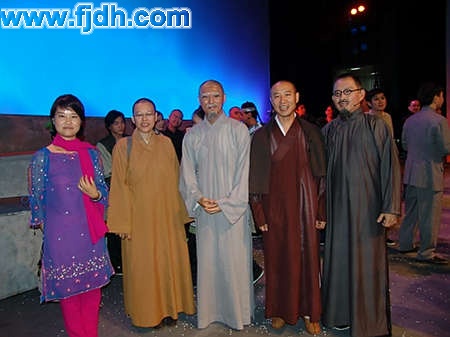 右起:丰子恺扮演者尤俊林、柏林禅寺明奘法师、弘一大师扮演者杨伟汉、吉隆坡鹤鸣禅寺传闻法师、佛音大家唱网站。
