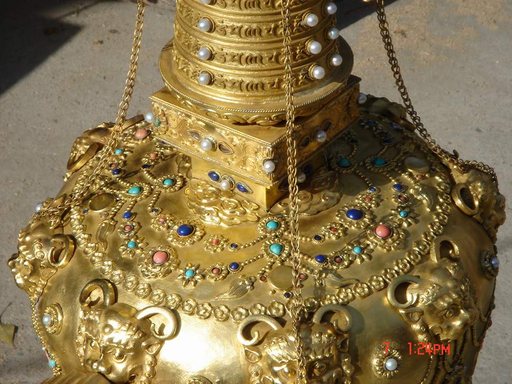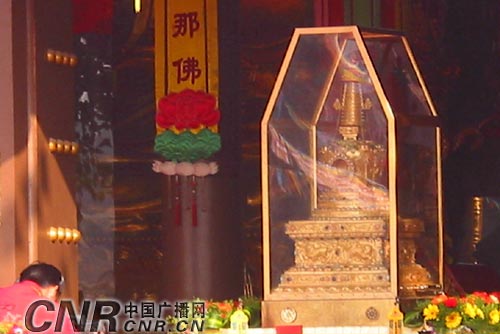 据悉,供奉佛指舍利的七宝佛塔由灵山公司捐赠。宝塔完全按照故宫所藏纯金七宝塔复制。共用黄金1300多克,镶嵌了珊瑚、松石、青晶等宝石近千颗,工艺精湛,美轮美奂。